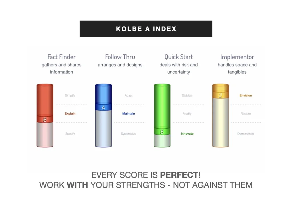 When you take this assessment, you’ll see numbers in 4 categories - Fact-finding, Follow-Through, Quick Start, and Implementation. Be sure to listen to the audios from Kolbe when you receive the link to your results. Kathy leads you through what each category and number means, and then my training brings them all together in how these insights work for artists, artisans, and other creatives.