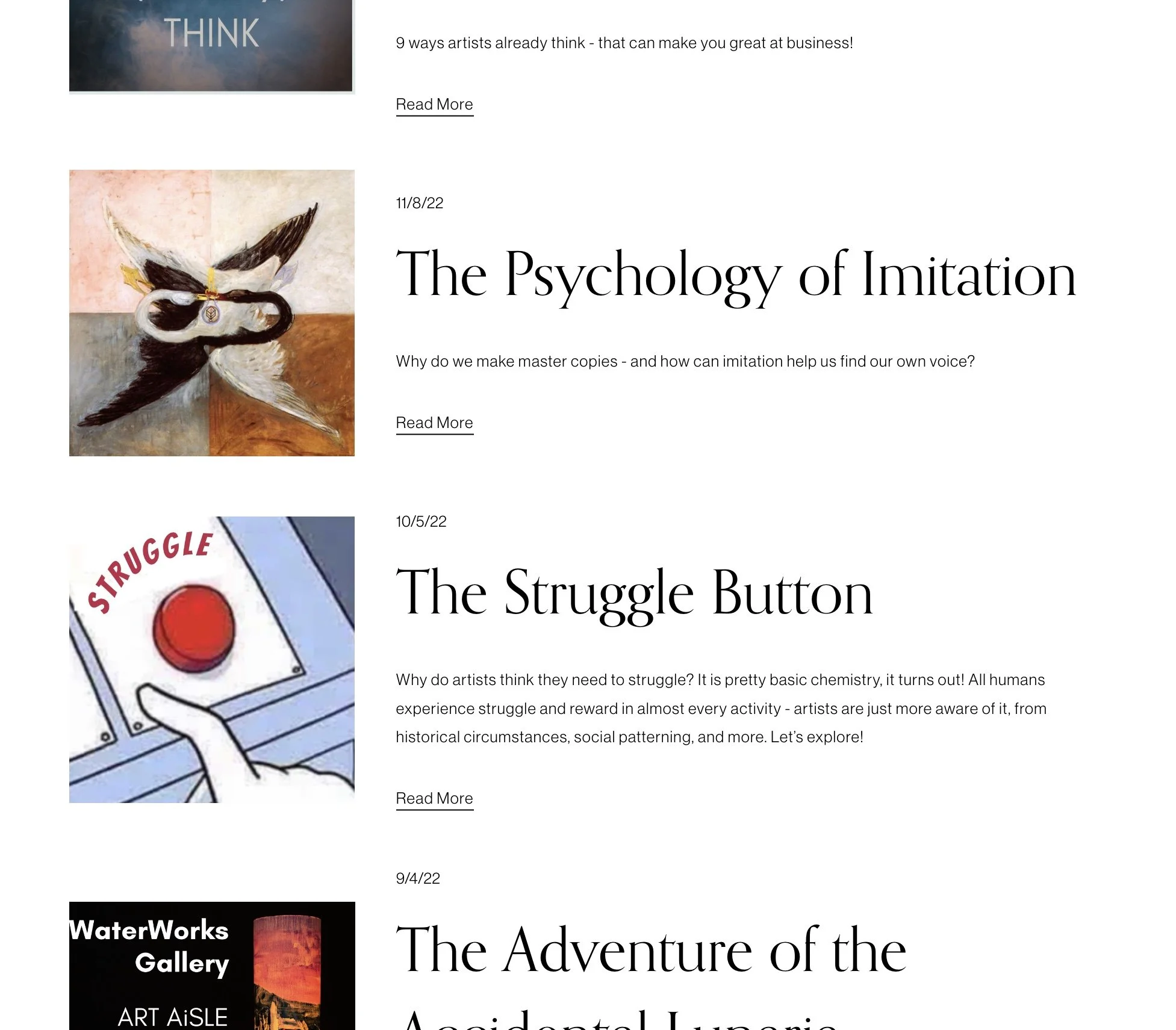 Since becoming an artist and coach over the past 7 years, I have written about the arts, creative process, entrepreneurship, mindset, and more.